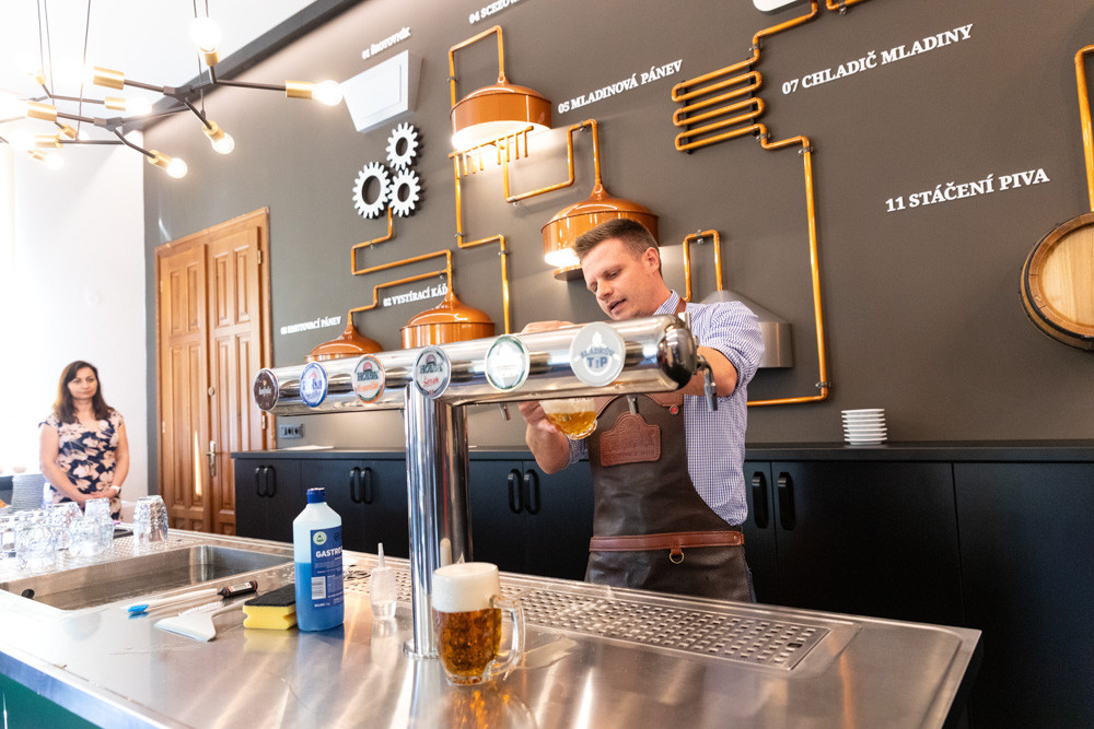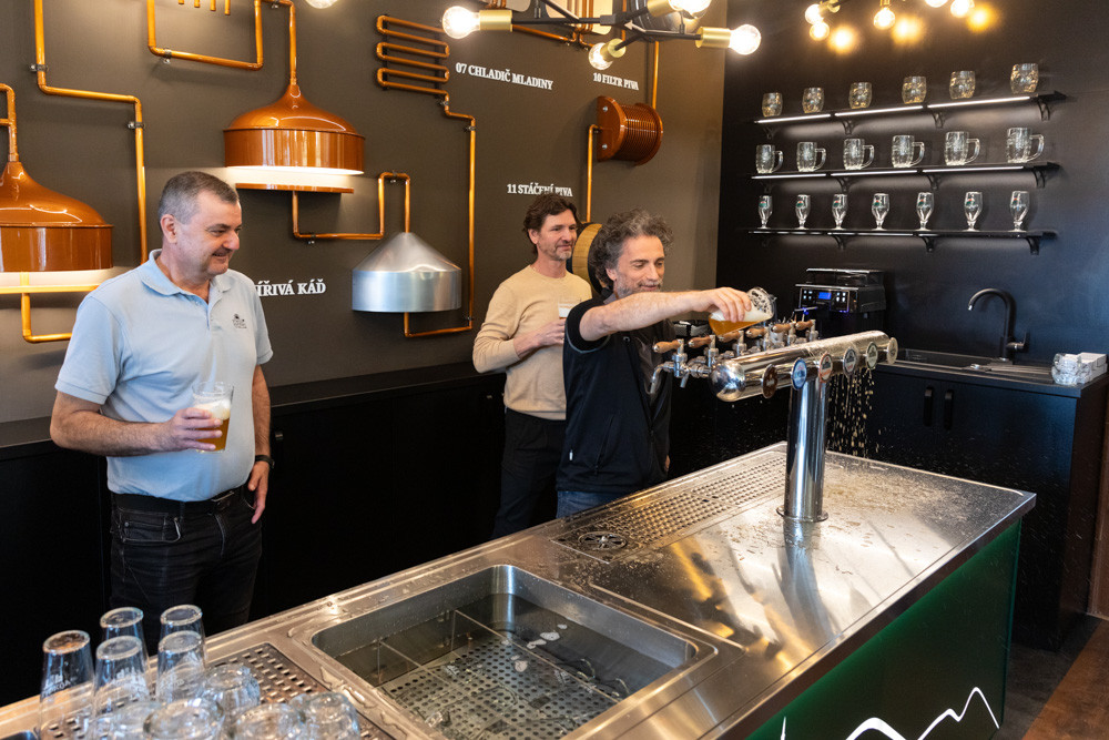 Jannis Samaras křtí výčepní pult v návštěvnickém centru, nalevo sládek pivovaru Holba Luděk Reichl