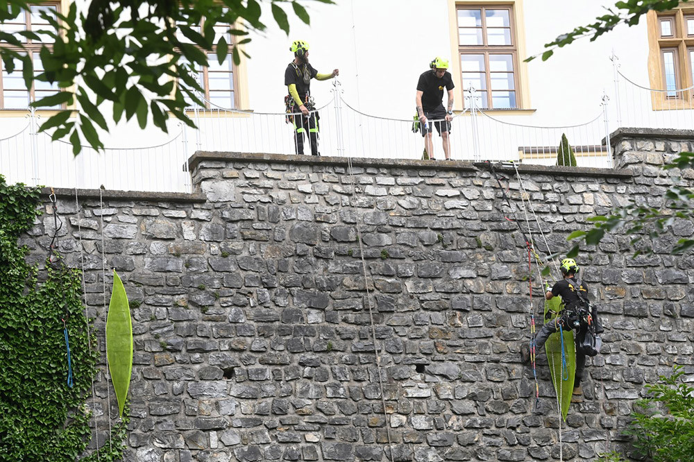 Specialisté pro výškové práce při instalaci prvních z pěti objektů německého výtvarníka Johannese Pfeiffera s názvem Záchranné čluny na kamennou zeď v Bezručových sadech