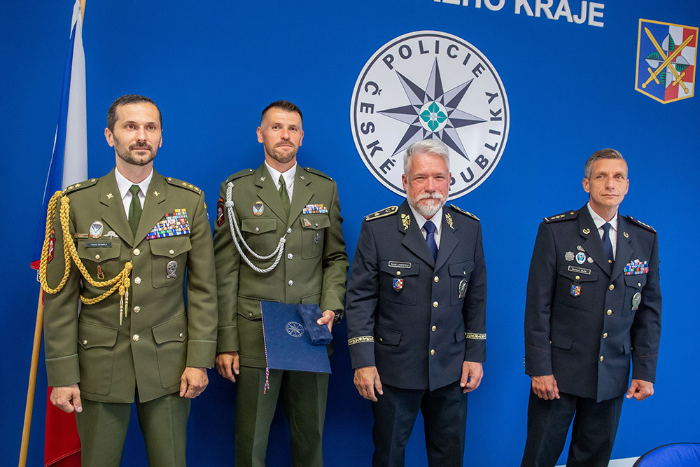 Ocenění převzal v sídle Policie ČR jeden ze svědků - voják z 601. skupiny speciálních sil Milan Hauer (druhý zleva)