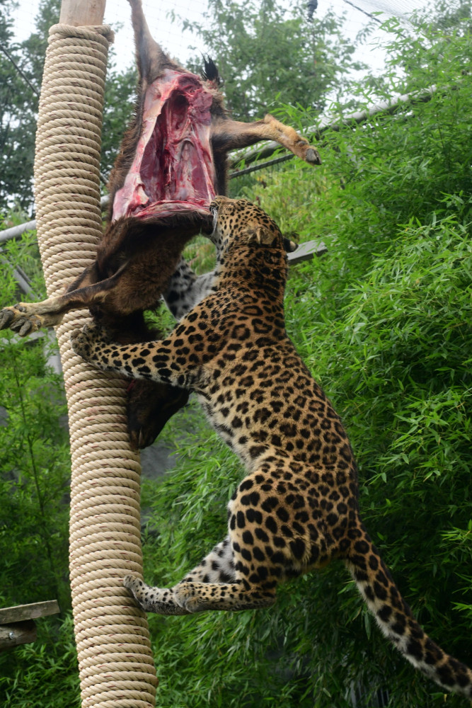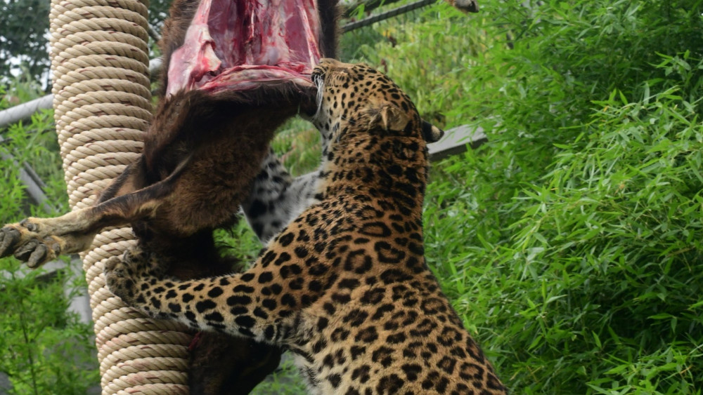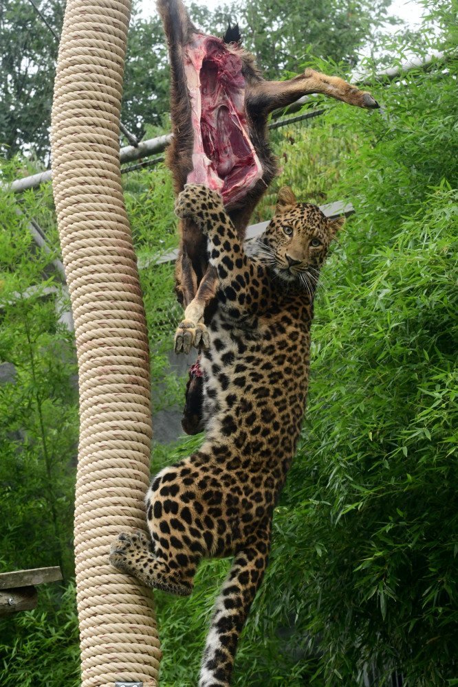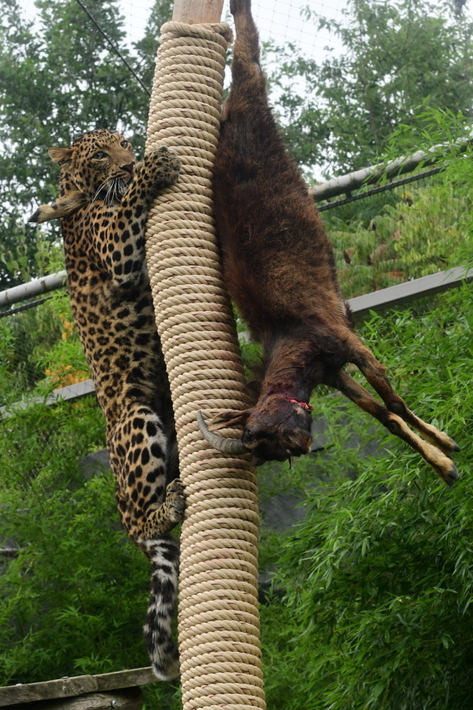 Levharti s v olomoucké zoo pochutnali na koze zavěšené na stromě. Chovatelé tak trénují jejich přirozené instinkty