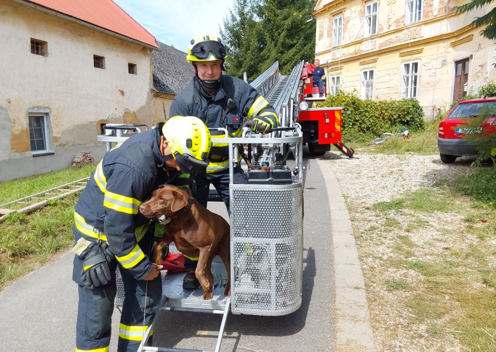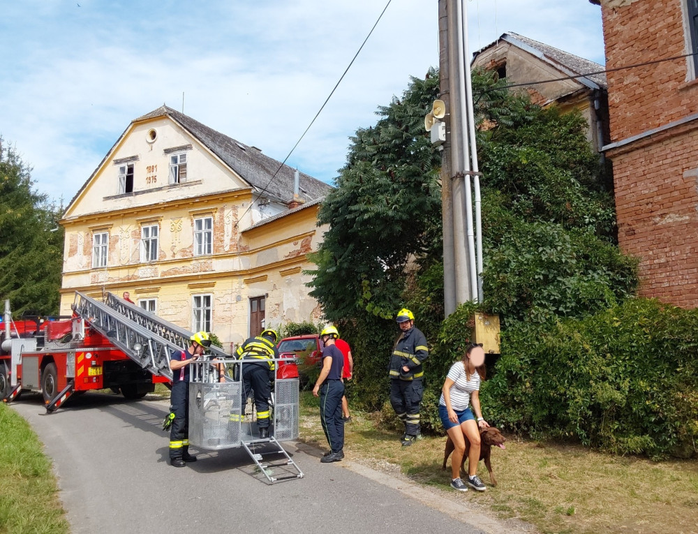 Operace labrador. Z římsy domu v Troubelicích hasiči sundávali psa, který zřejmě pronásledoval kočku