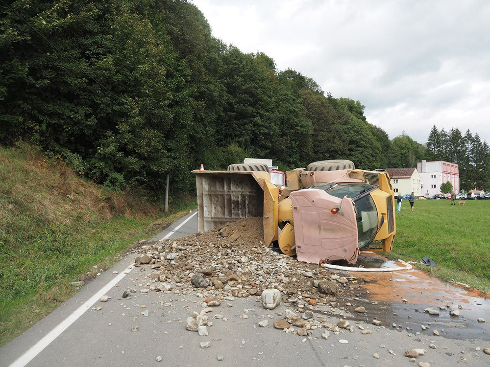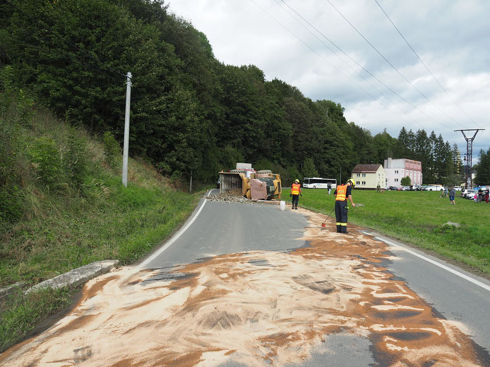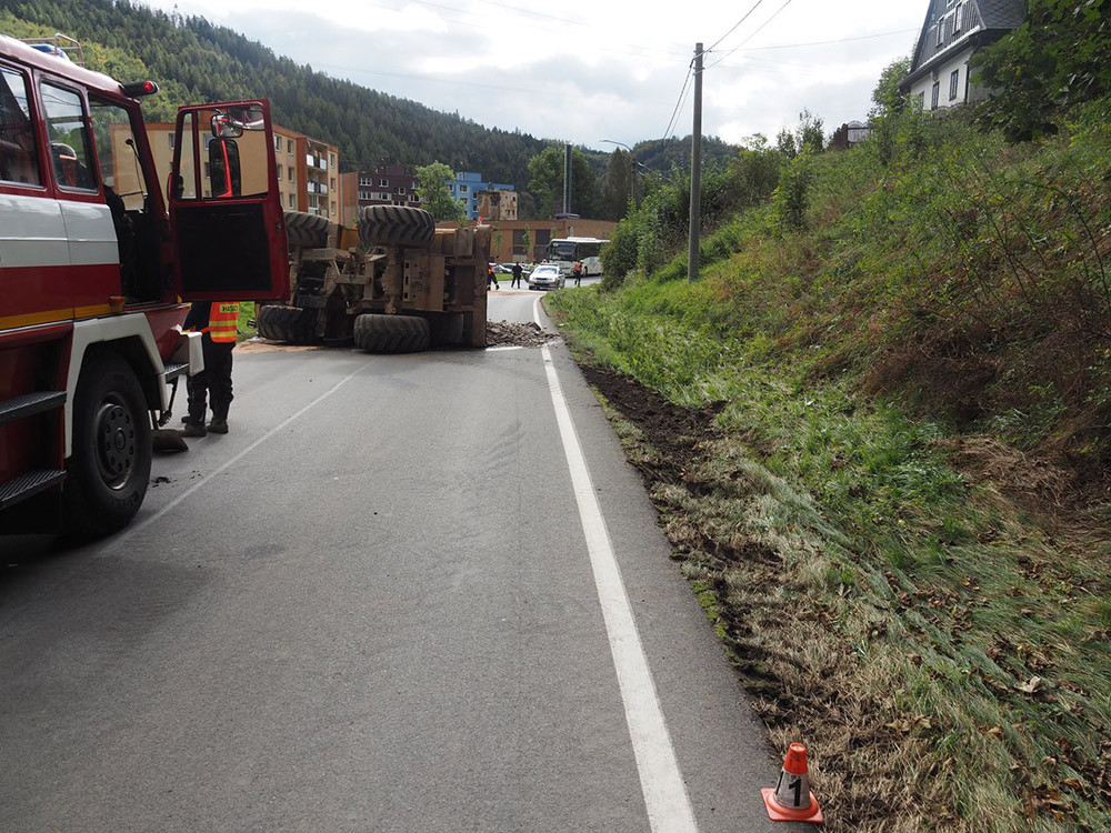 Řidič převrátil na silnici v Hanušovicích sklápěč s kamením. Zkouška na alkohol byla pozitivní