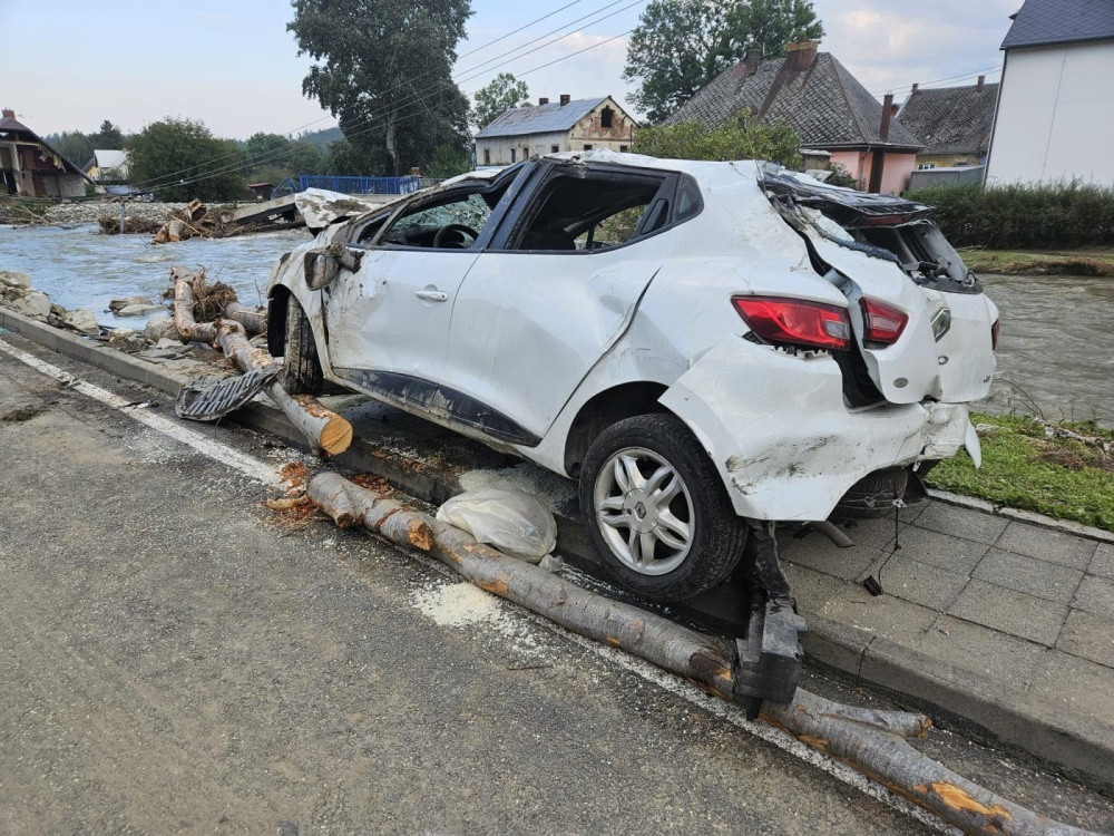 Zdemolované auto, které za tmy spadlo do rozbouřené řeky v Kobylé nad Vidnavkou