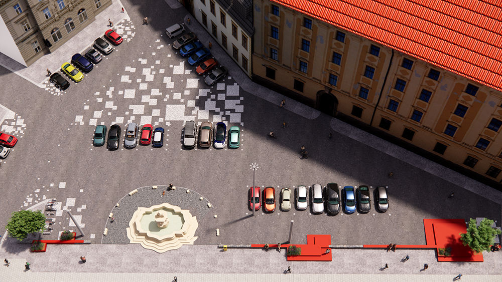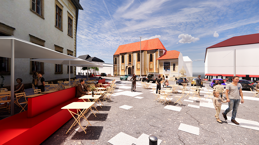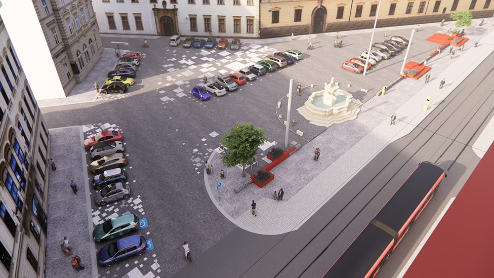 Vizualizace z rozpracované studie proměny náměstí Republiky v Olomouci, která nabízí varianty trvalé či sezonní úpravy