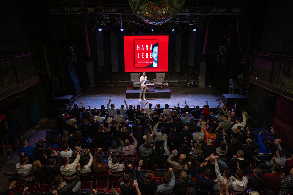 Moderátor Lukáš Krbeček při živém natáčení podcastu HanáJede v olomouckém S-klubu