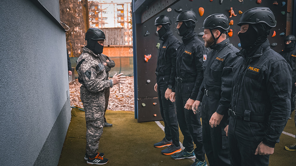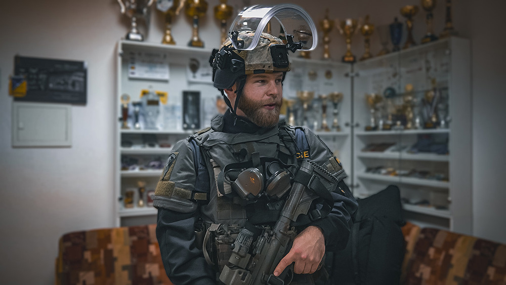 Ondřej Havlíček při natáčení videa u policejní zásahové jednotky
