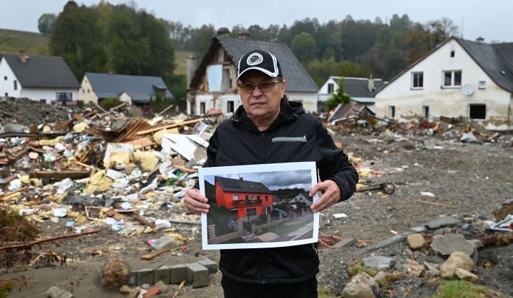 Petr Harazin u trosek svého domu drží fotku s jeho původní podobou, peníze od pojišťovny na stavbu nového už má na účtu