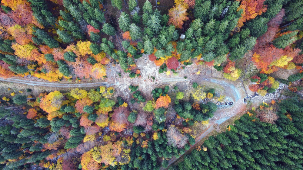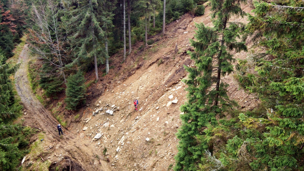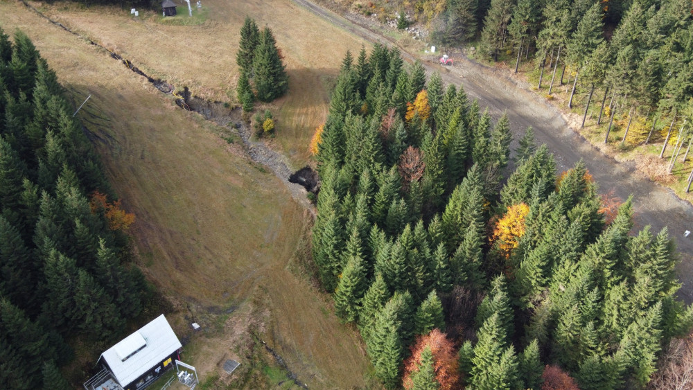 Začátek sesuvu ve smrčině nad Milionovou cestou. Cesta těsně po opravě. Dolní část severního svahu Velkého Klínovce.