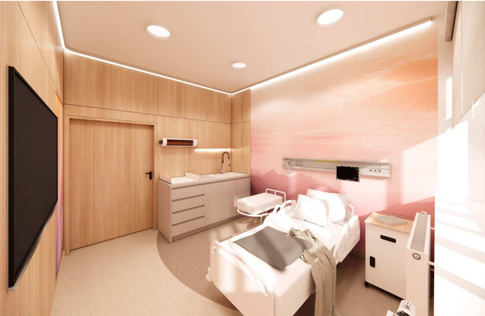 Vizualizace pokoje na oddělení šestinedělí šternberské porodnice po dokončení modernizace
