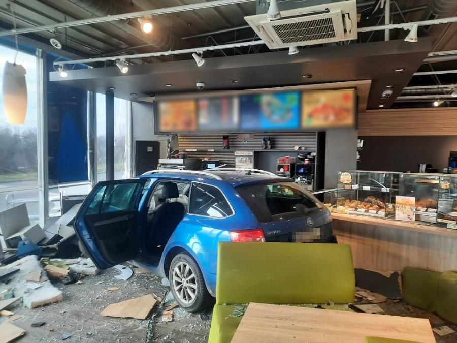 Řidič na dálnici nezvládl odbočku na čerpací stanici. Vjel až do prodejny