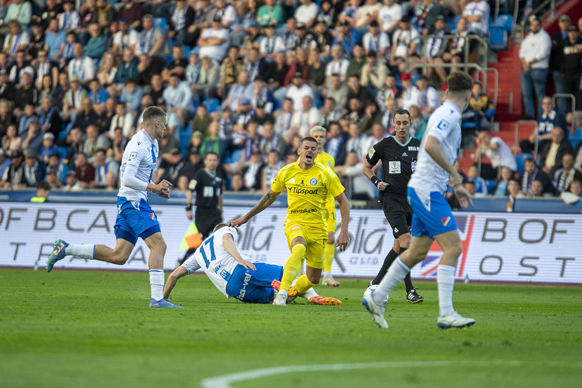 Jan Kliment padá po faulu Michala Frydrycha z Baníku Ostrava