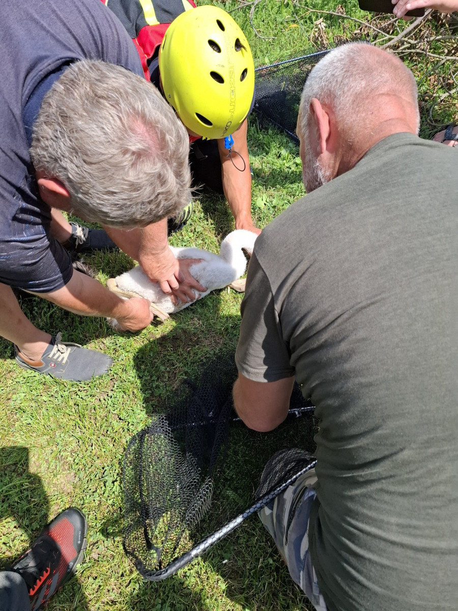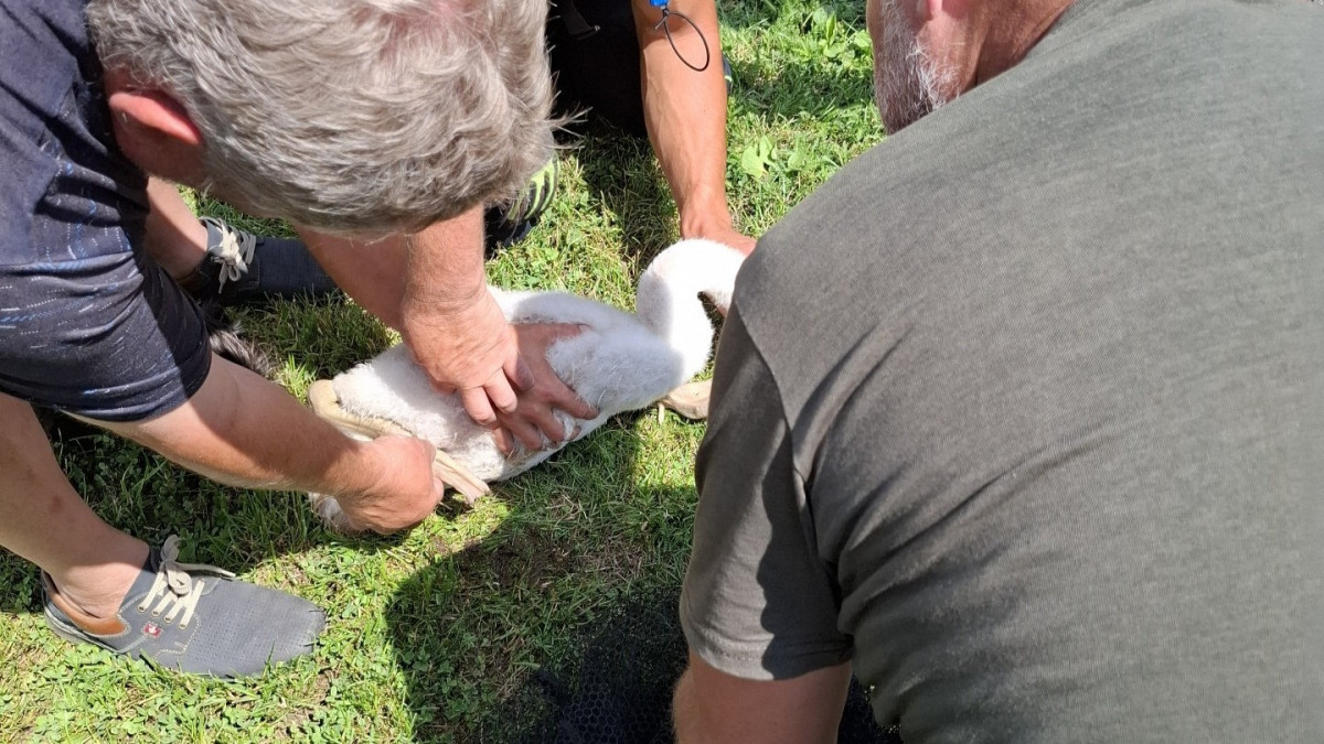 Labuť v nesnázích. Na Oborníku v Zábřehu hasiči zachraňovali mládě zamotané do vlasců