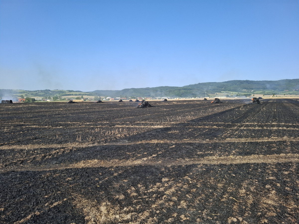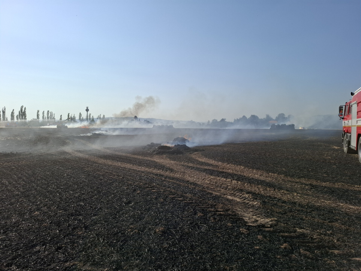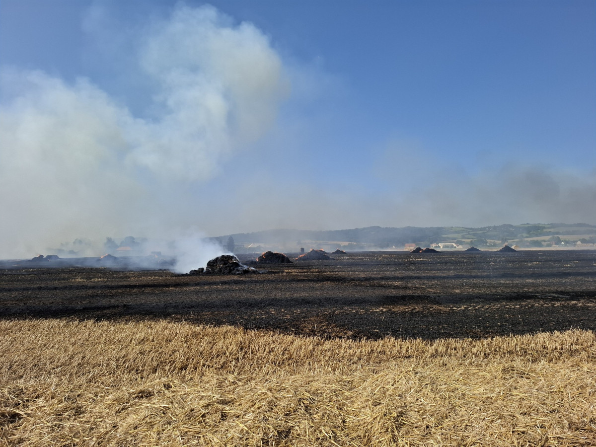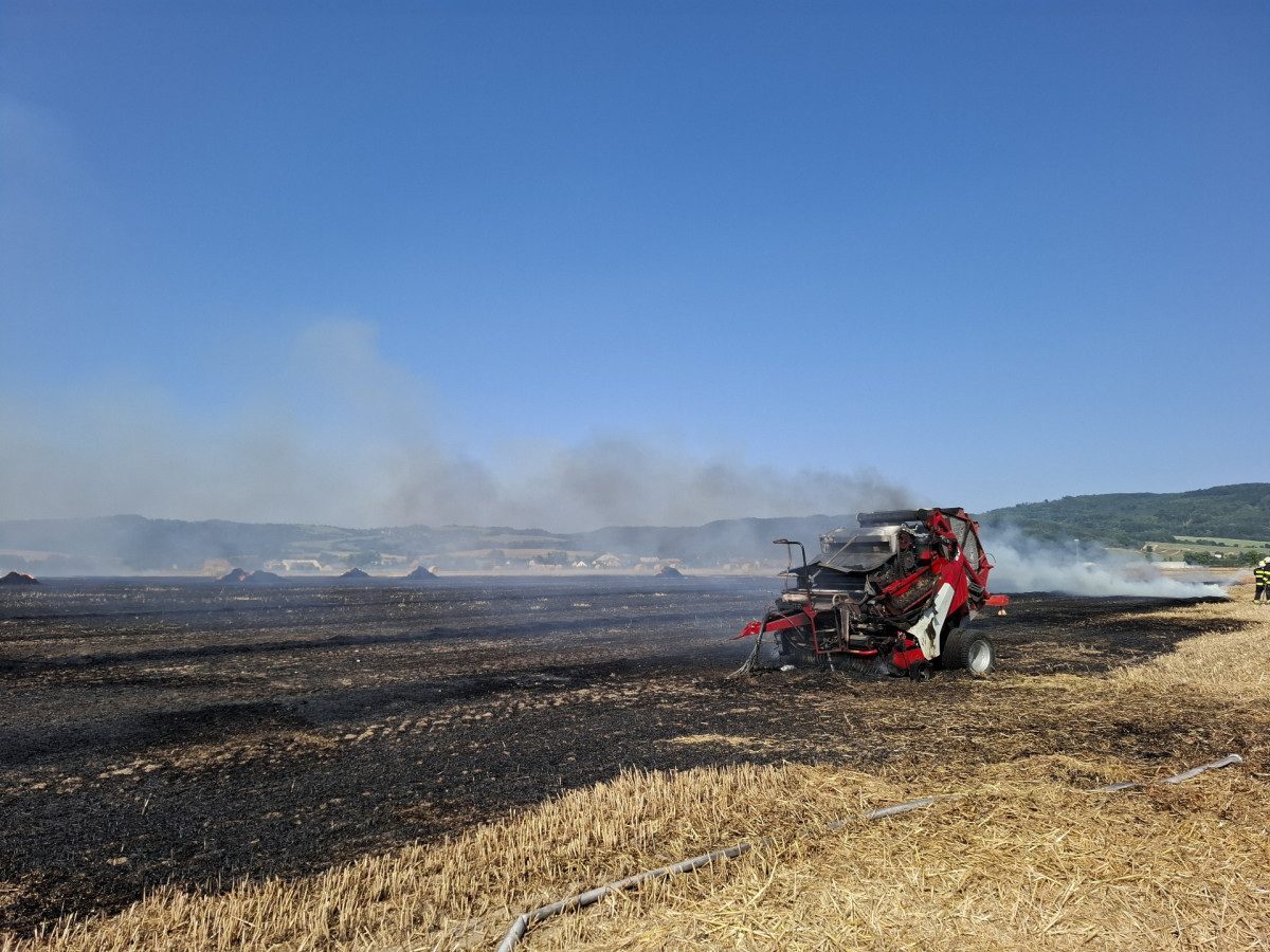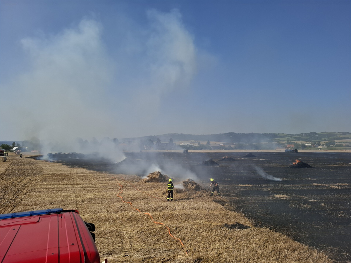 Padesát balíků slámy v plamenech. Hasiči likvidovali požár pole a zemědělského stroje u Dlouhé Loučky