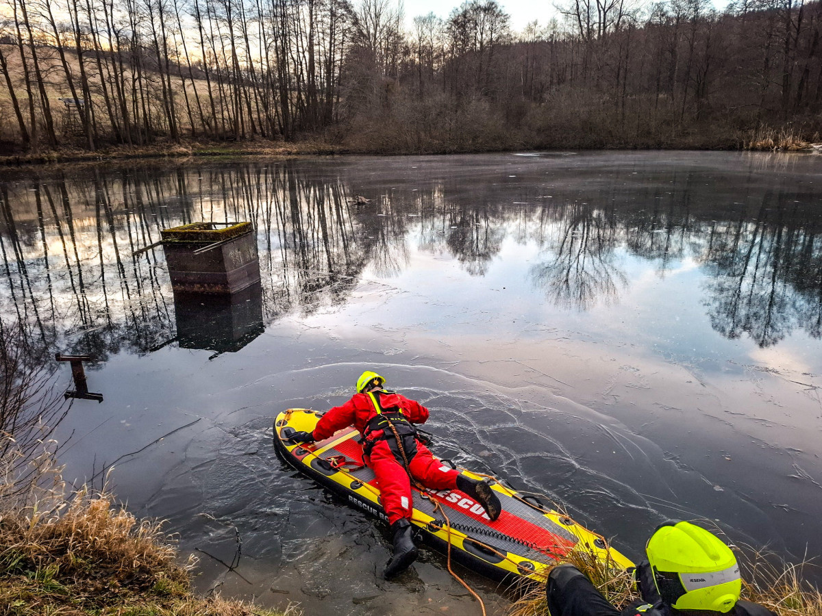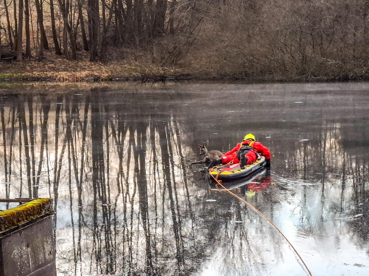Hasiči zachránili srnku uvězněnou na rybníku v Jeseníku. Zásah komplikoval tenký led