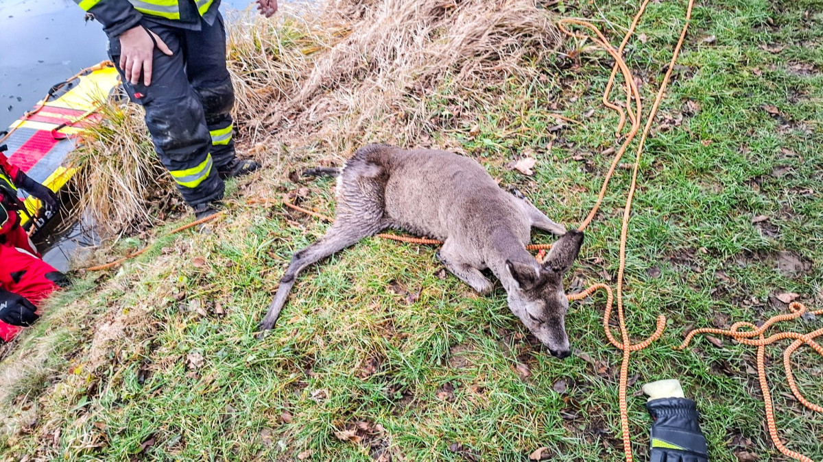 Hasiči zachránili srnku uvězněnou na rybníku v Jeseníku. Zásah komplikoval tenký led