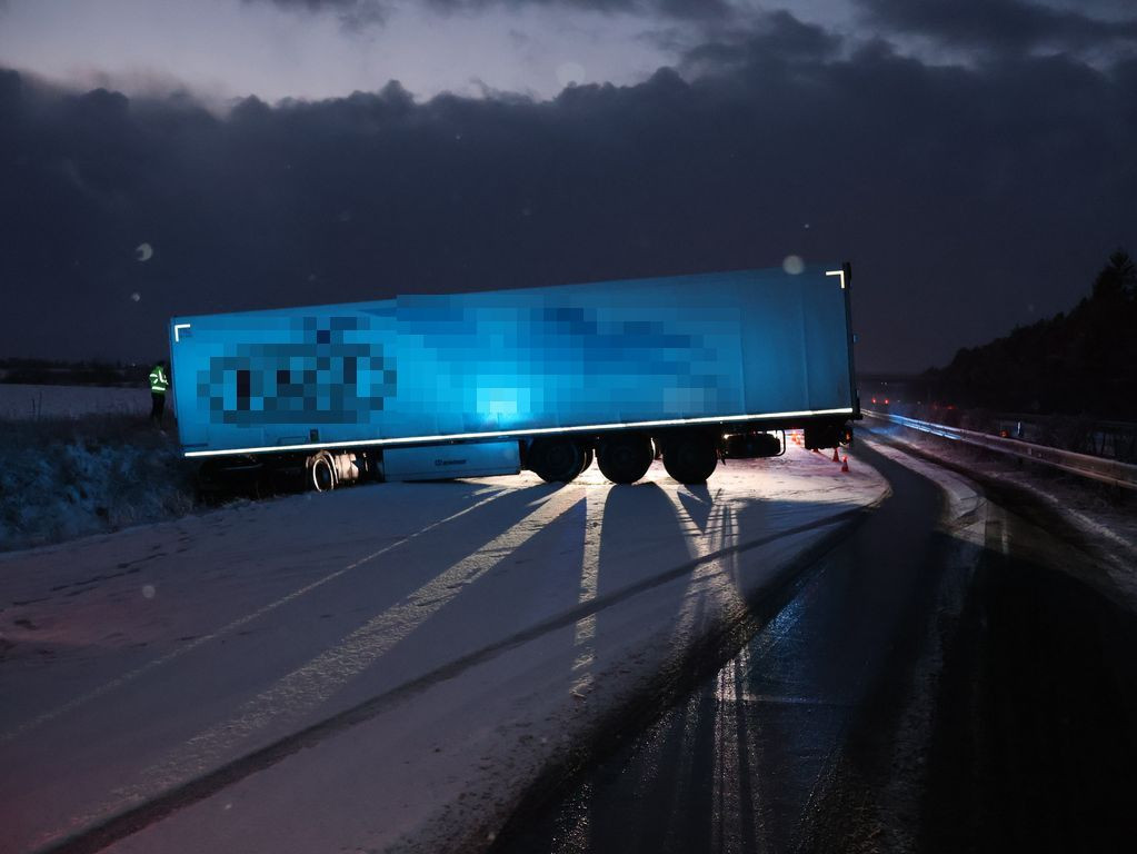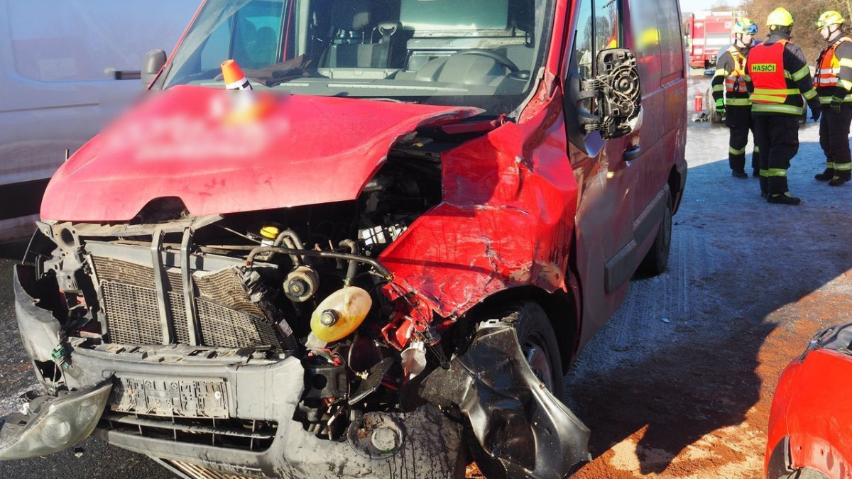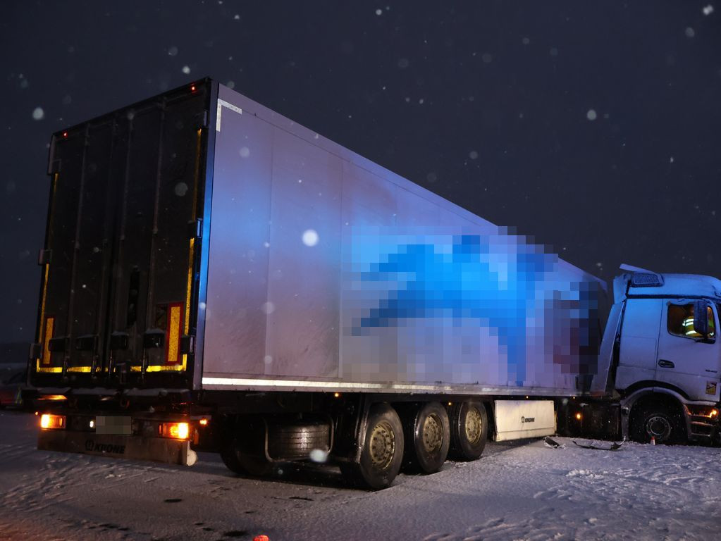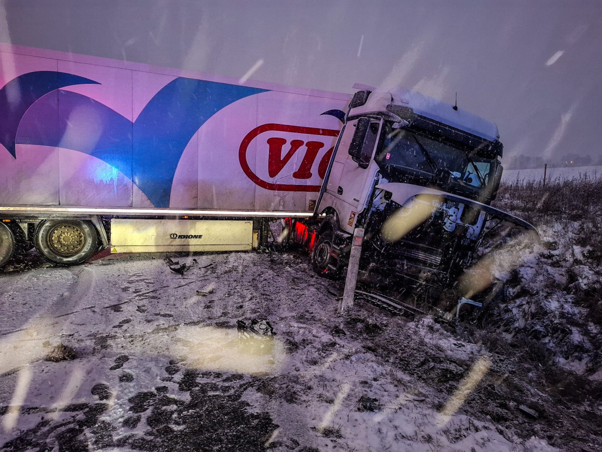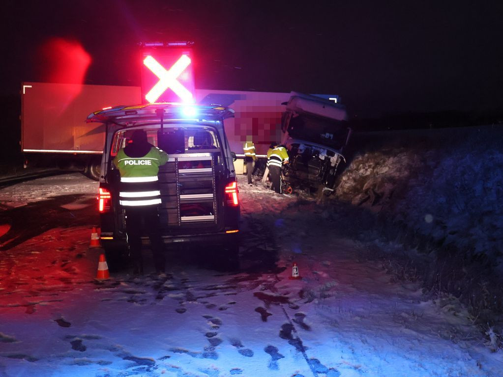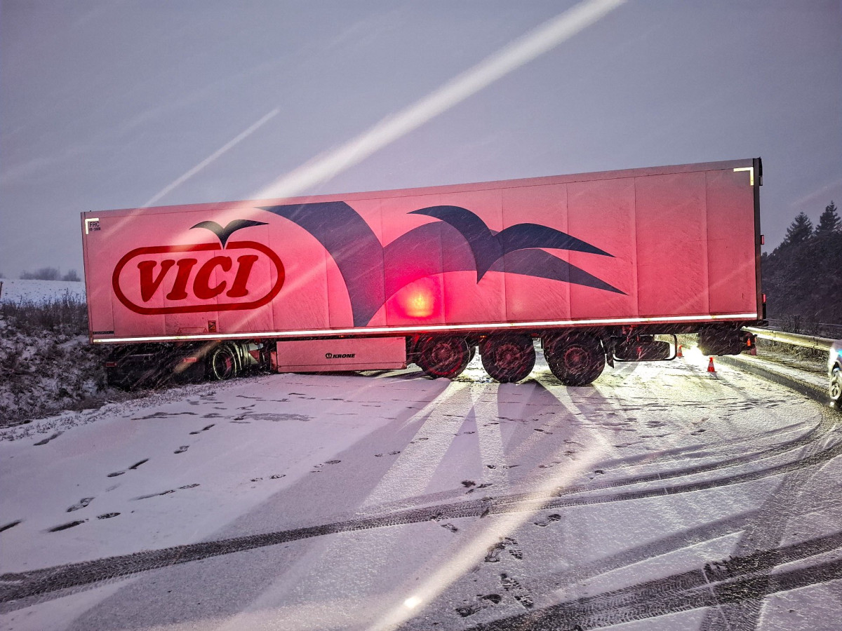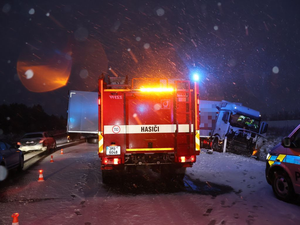 Řidiči podcenili sněžení. Hromadná nehoda u Mohelnice, kamiony zablokované na dálnici