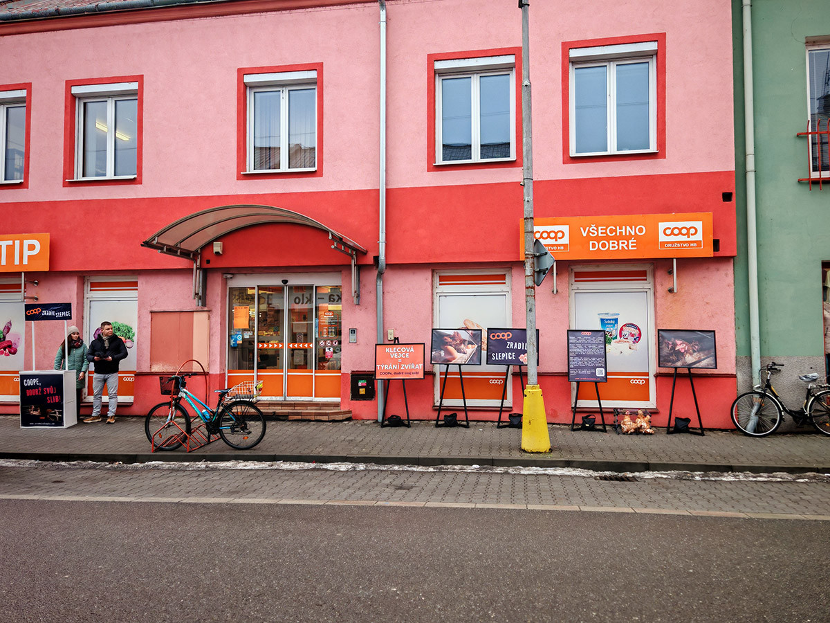 Proti vejcím z otřesných podmínek. Obránci zvířat protestovali před obchodem v Litovli