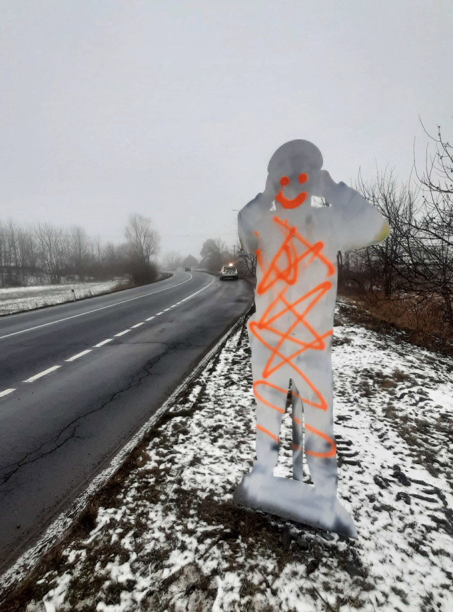 Posprejovaná maketa policisty u obce Křelov-Břuchotín na Olomoucku