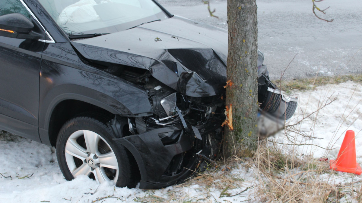 Na Přerovsku auto dostalo na náledí smyk a narazilo do stromu. Škoda je přes čtvrt milionu
