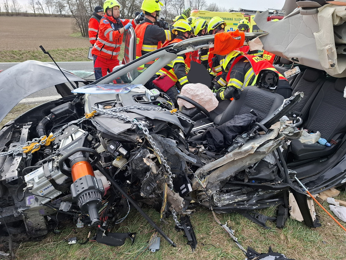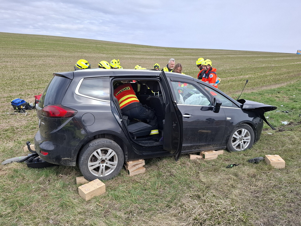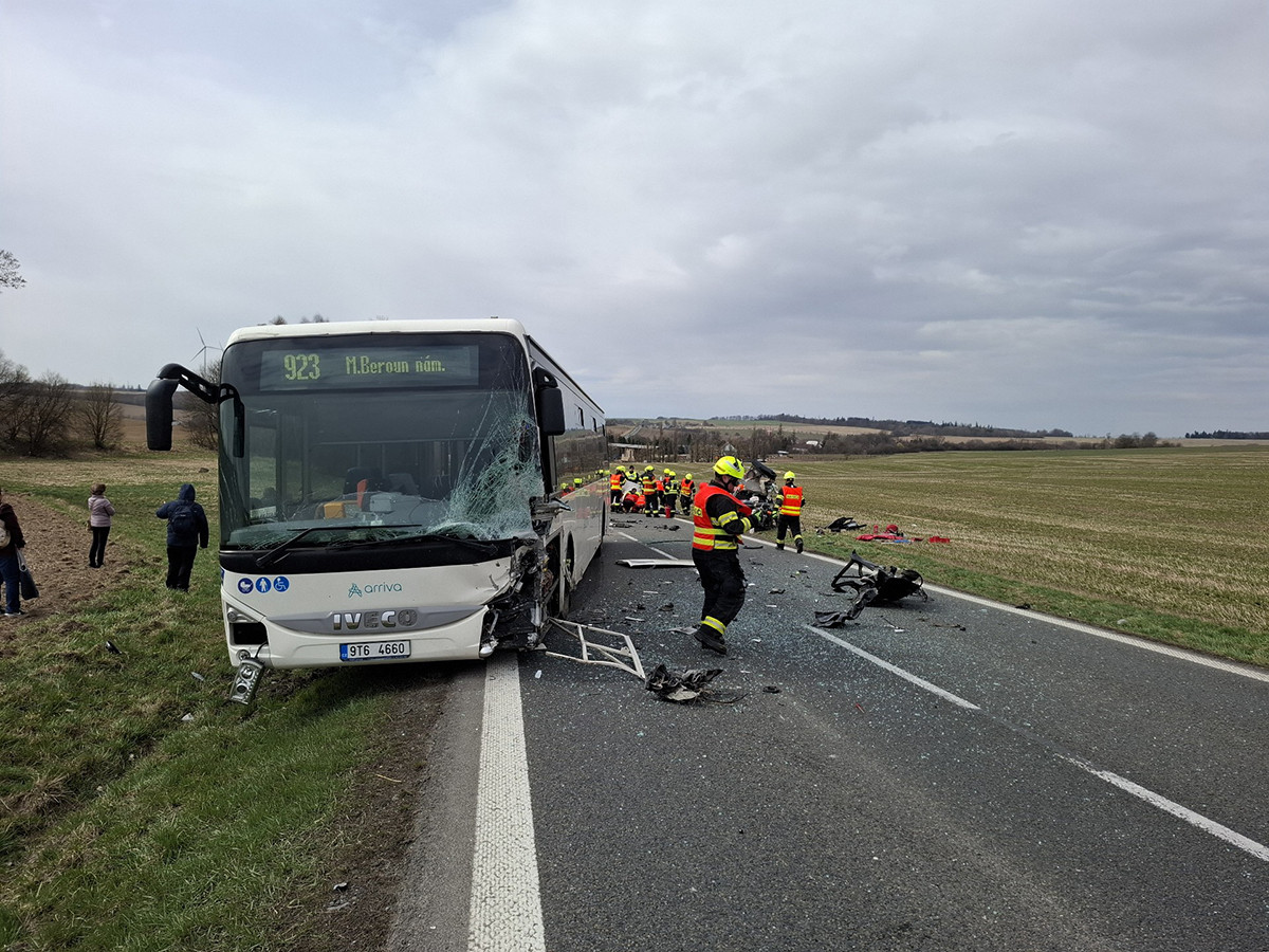 Čelní střet auta s autobusem. Ke hrozivé nehodě na Šternbersku letěl i vrtulník