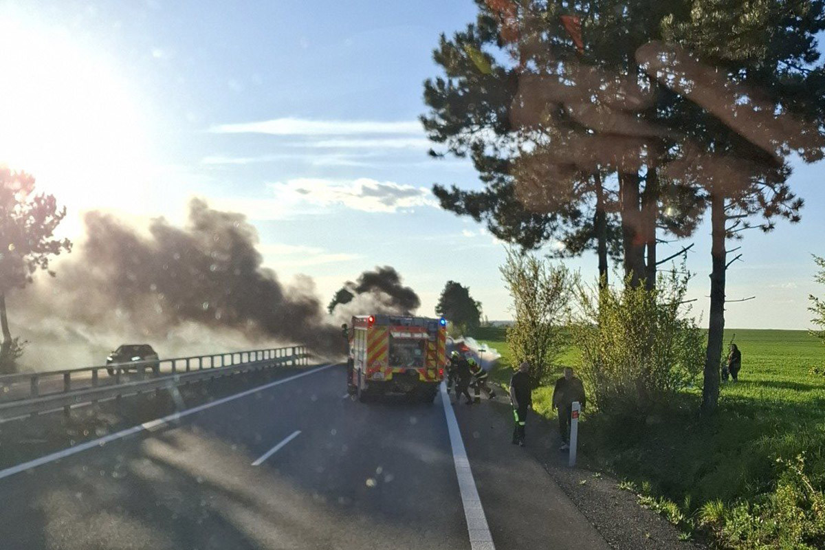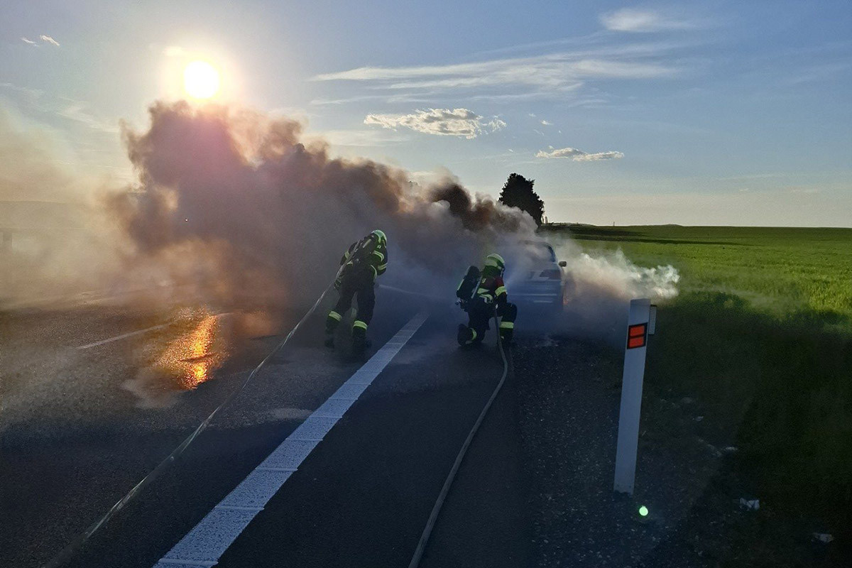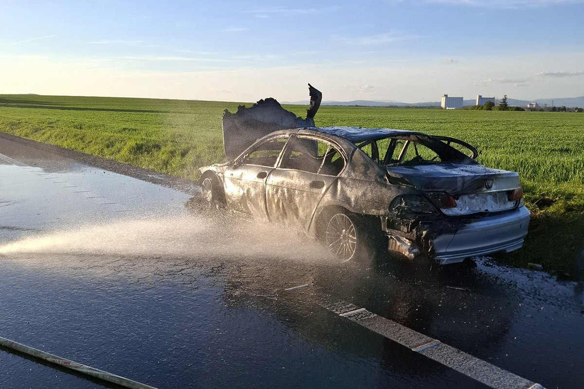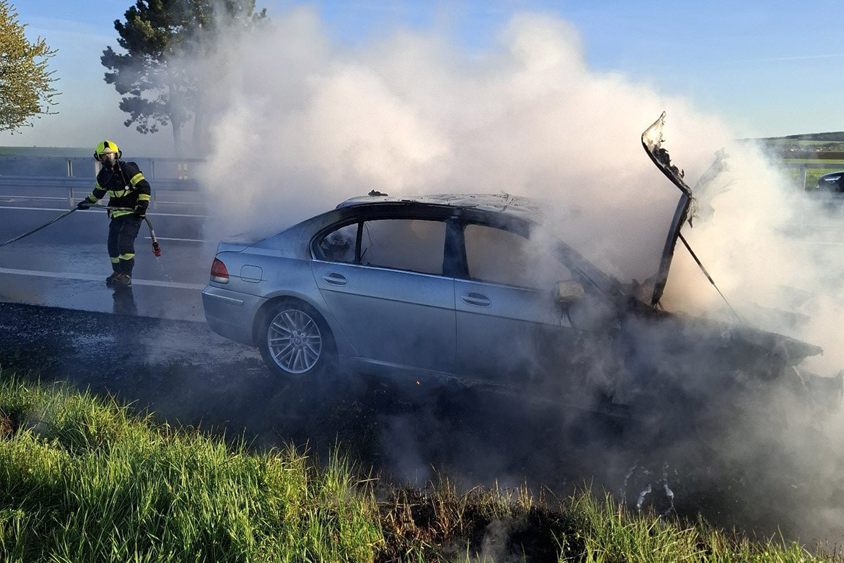 Hořící BMW zablokovalo D35 u Litovle, hasiči zasahovali v dýchací technice