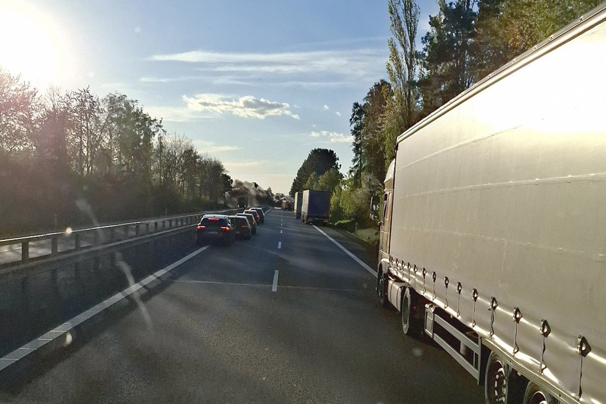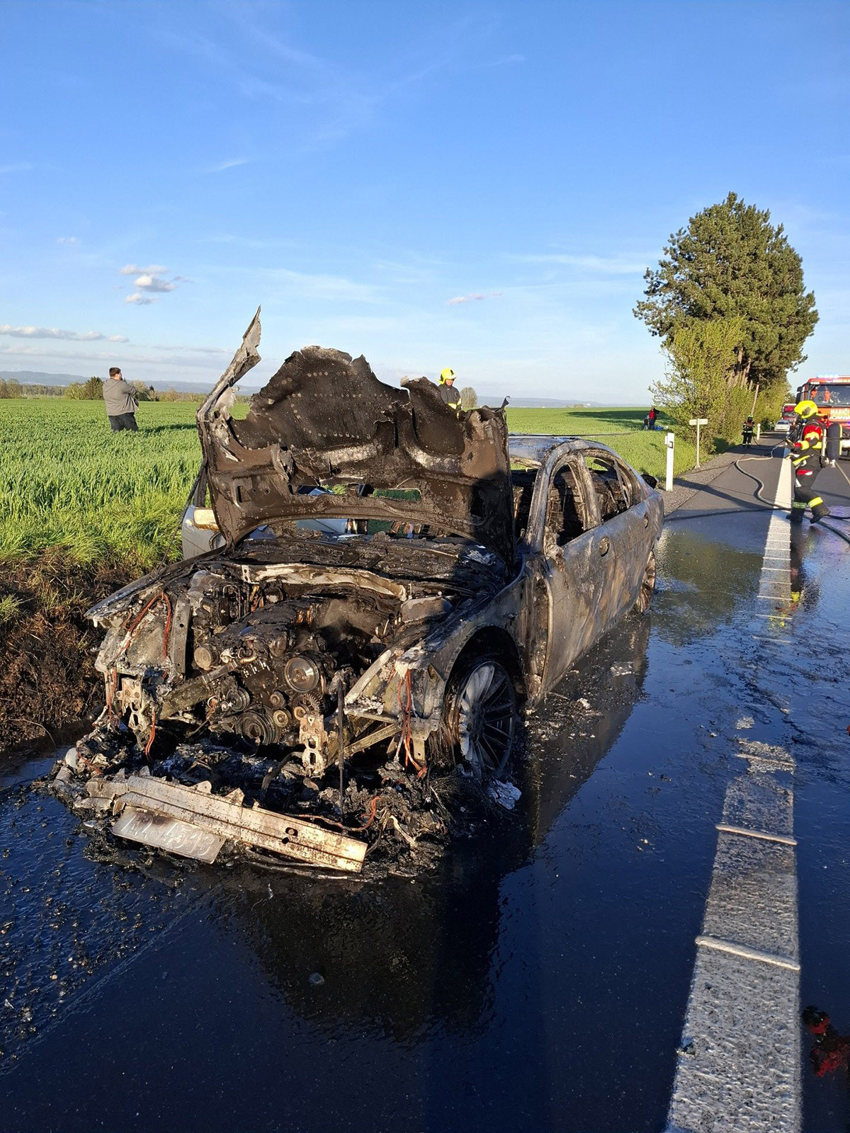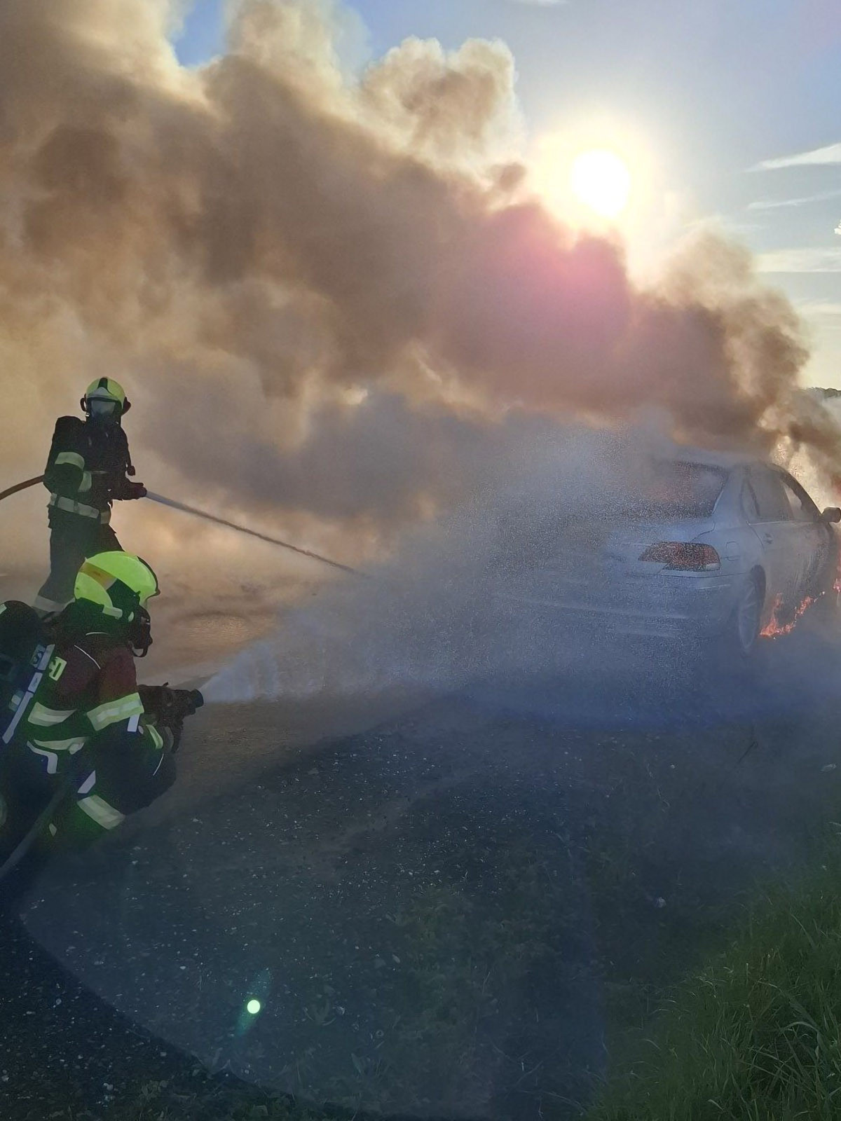Hořící BMW zablokovalo D35 u Litovle, hasiči zasahovali v dýchací technice