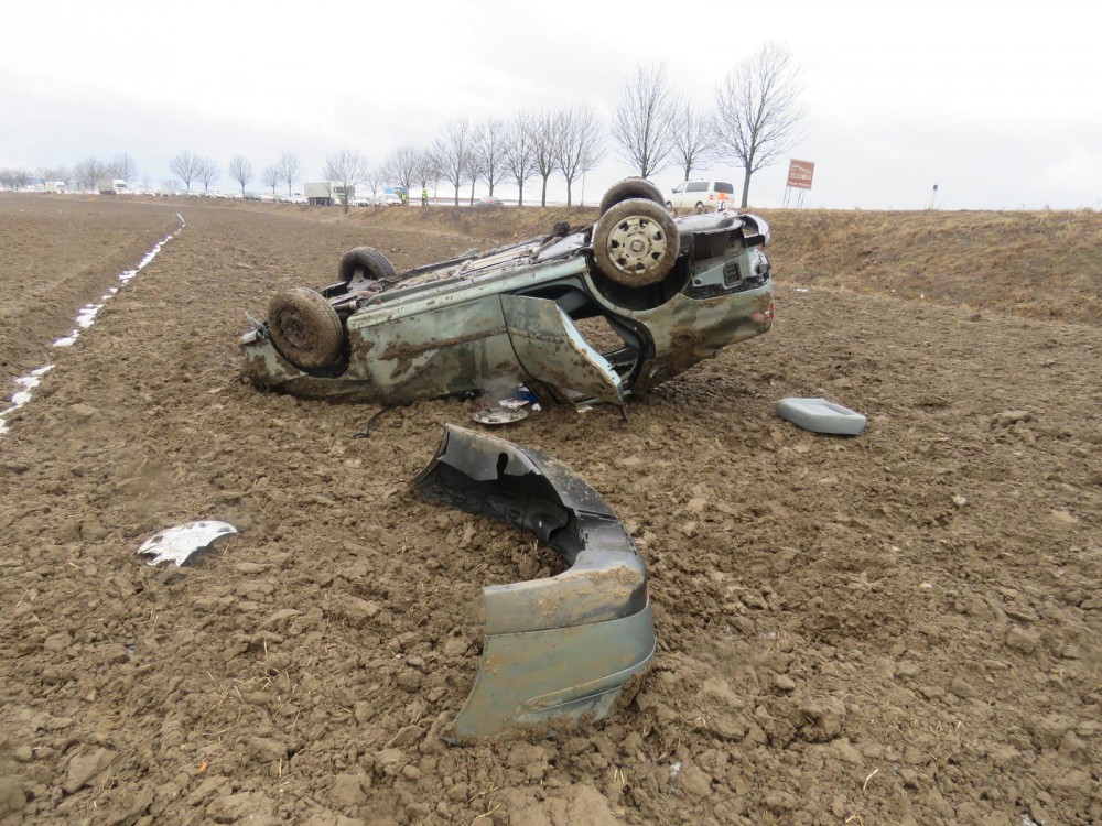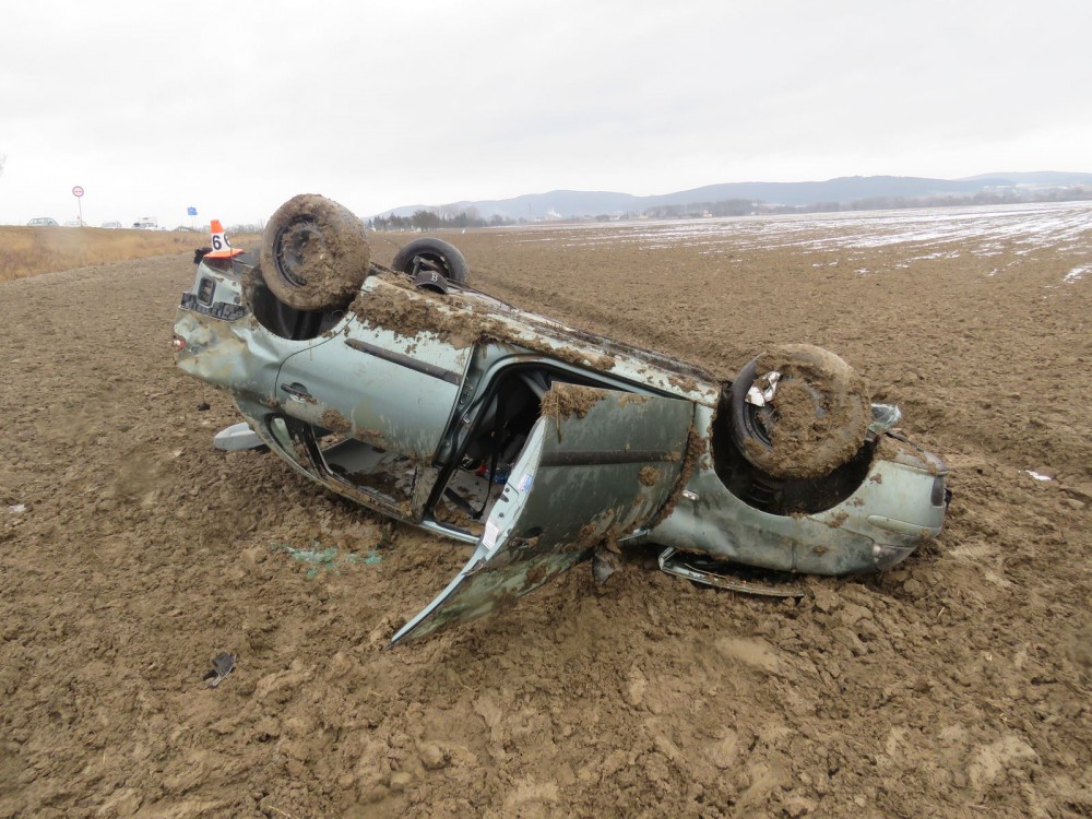 Devatenáctiletý řidič nezvládl svoje auto, po několika přemetech skončilo na střeše v poli