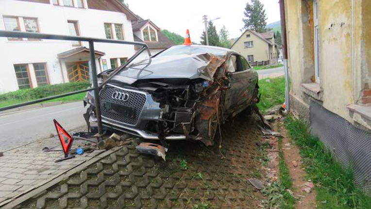 Řidič nezvládl se svým vozem zatáčku. Těsně minul maminku s kočárkem a skončil v zábradlí
