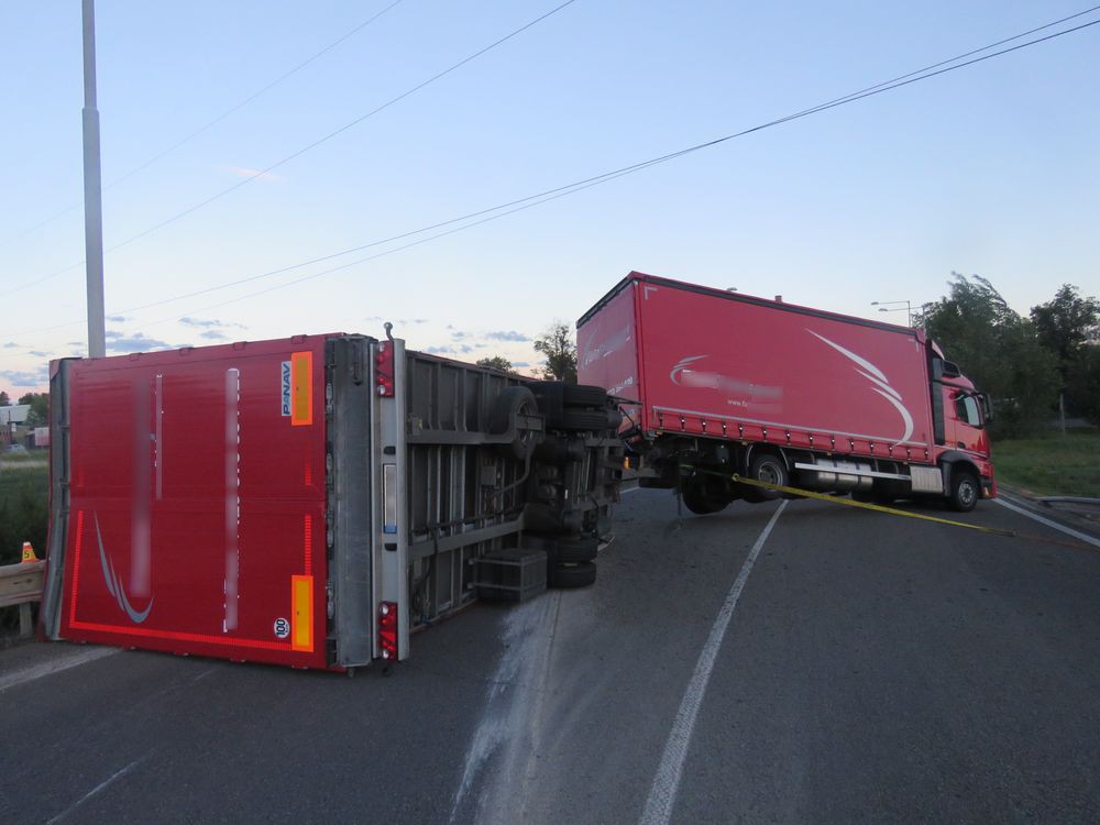 Řidič kamionu převrátil svůj přívěs na bok. Zablokoval sjezd z dálnice na čtyři hodiny