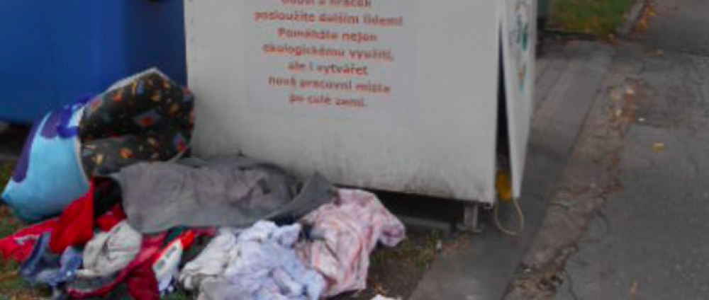 Vandal poškodil v centru města kontejner na oblečení. Oděvy se válely všude okolo
