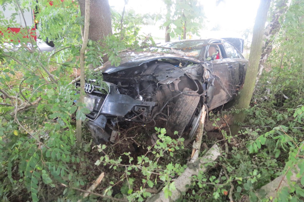 Opilý řidič u Domašova nezvládl své auto, skončil s ním mezi stromy