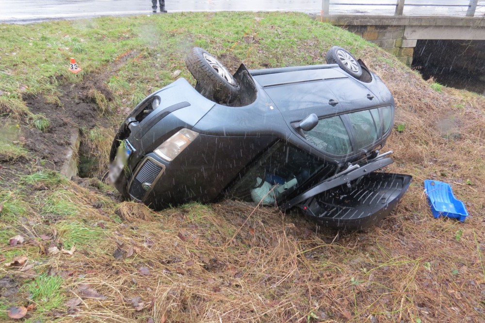 Řidič jel příliš rychle a převrátil auto na bok. S manželkou a dvěma dětmi byl převezen do nemocnice