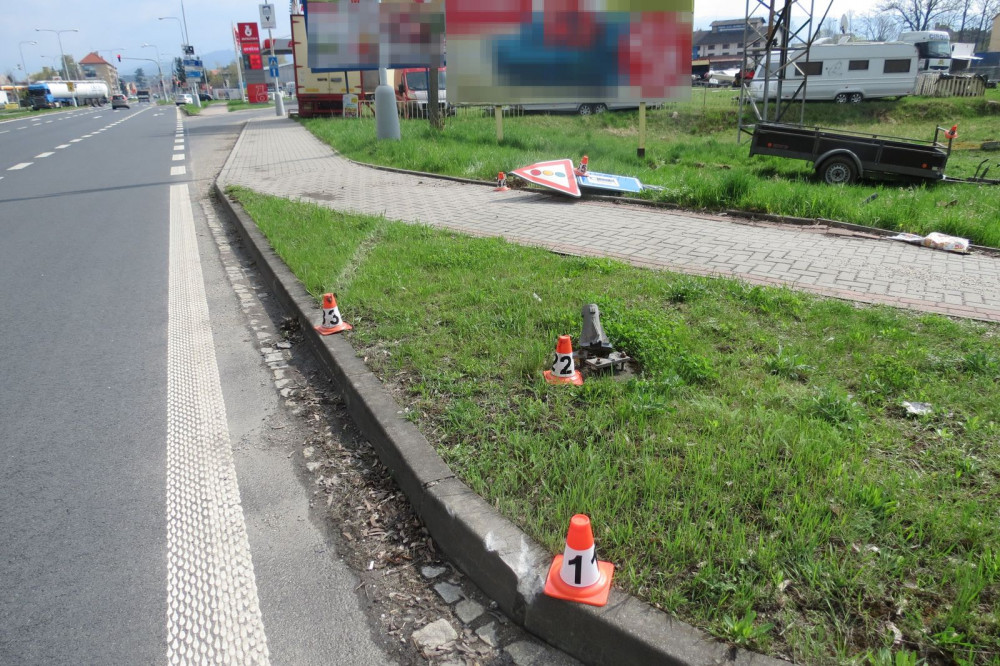 Řidiči se z auta odpojil přívěsný vozík, ten přejel chodník a zboural značku