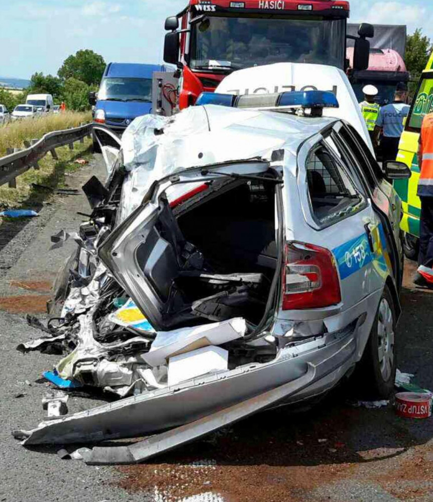 Do policejního auta na dálnici u Nákla narazil kamion, tři policisté se zranili