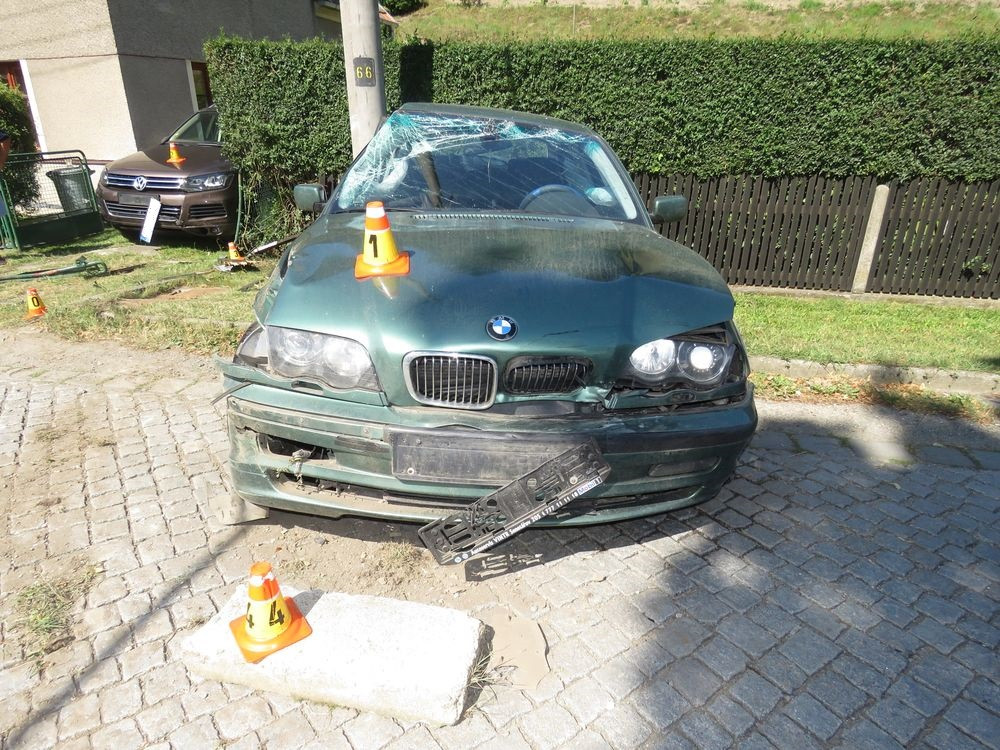 Řidič dostal smyk. Naboural zaparkované auto, plot domu a sloup vysokého napětí