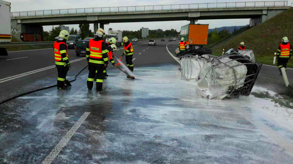 AKTUÁLNĚ: Na dálnici z Olomouce na Ostravu se na silnici vylilo z devíti kubíkových barelů lepidlo
