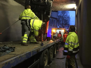 "Nákladní vozidlo převážející vysokozdvižné vozíky se při jízde zaseknulo pod mostem a bylo nutné nejprve provést kontrolu stavu po kolizi a přivolání statika se specializací na mostní konstrukce a v následujícím čase pokračovat v bezpečném vyproštění převáženého nákladu," sdělil mluvčí hasičů Zdeněk Hošák.