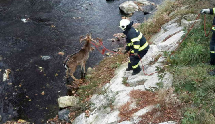 Při odchytu daňka museli v sobotu dopoledne hasiči asistovat jesenické městské policii. Daněk pobíhal v Šumperské ulici v Jeseníku mezi auty, nakonec skončil v potoce, odkud jej pomocí lan hasiči vytáhli.