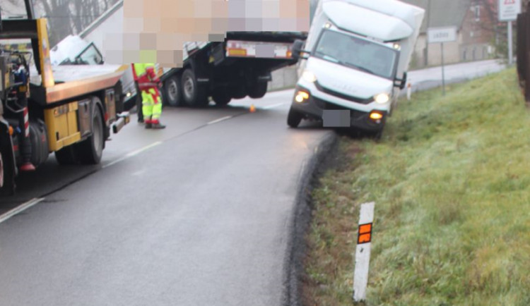 „Nákladní vozidlo Iveco s návěsem, které řídil 57letý řidič a jel ve směru od Šternberka k obci Lužice, v mírné pravotočivé zatáčce pravděpodobně nepřizpůsobil rychlost jízdy dopravně technickému stavu vozovky a při míjení se s protijedoucí nákladní soupravou se měl snažil najet s vozidlem maximálně k pravému okraji komunikace. Při tom měl sjet pravou stranou návěsu do příkopu a při návratu na komunikaci měl pak přejet do protisměru, kde havaroval do příkopu," popsala policejní mluvčí Irena Urbánková. V místě později uvízla dodávka, která chtěla nákladní auto objet.
