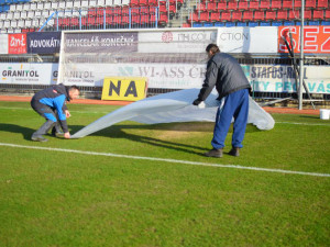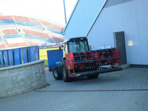 Z kotelny míříme zkontrolovat tréninková hřiště a umělou trávu na místě bývalého spartakiádního stadionu. „Umělku musíme pročistit od nejrůznějších nečistot a v zimě při odklízení sněhu traktorem společně s tím sněhem bereme i ten gumový granulát, který pak musíme zase doplňovat. Umělá tráva se musí solit, aby nebyla zmrzlá. Hodíme tam třeba tři sta kilo průmyslové soli,“ vyjmenovává Dušan povinnosti spojené s umělou trávou.