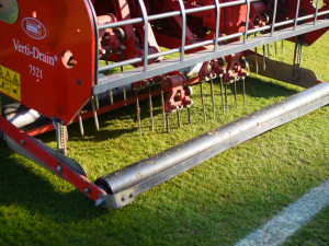 Z tréninkového hřiště jdeme zpátky do zázemí, kde Dušan bere malé vidle, které si přivezl Anglie a vytáhne z hřiště kus trávníku, aby mi popsal strukturu. „My tady nemáme koberec, my sejeme. Je to nesrovnatelně levnější. Koberec na hřiště stojí třeba pět milionů, u nás celá operace stojí asi půl milionu. Tady vidíme kořeny. Jsou bílý, to znamená, že jsou zdravý a na to, že je únor, jsou poměrně dlouhý. Ta drobnější vlákna, to je umělá hmota, která je do toho písku zamíchaná, aby držela stabilitu trávníku,“ popisuje Dušan.