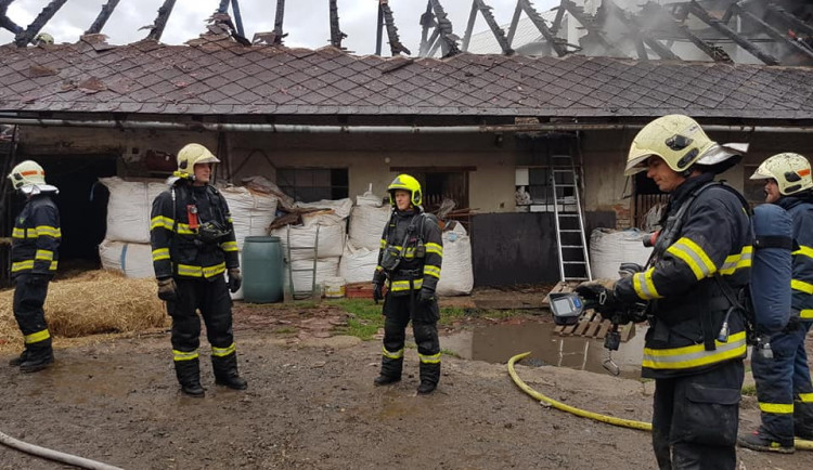 V pondělí odpoledne hasily střechu hospodářské budovy čtyři jednotky profesionálních i dobrovolných hasičů v Třebčíně, místní části Lutína.