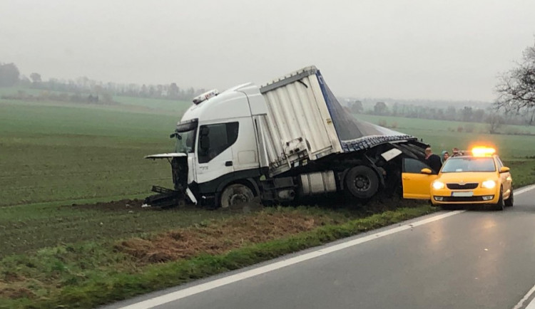 Dnes před čtvrtou hodinou ranní havaroval kamion s nákladem mezi Olomoucí a Šternberkem před odbočkou na Štarnov. Čeká na vyproštění.