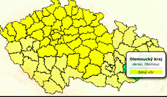 Podle informací ČHMÚ bude na většině území České republiky vát silný vítr. Výstraha platí už od včerejšího odpoledne, kdy foukalo spíše na severu, postupně se však vítr dostane i do Olomouckého kraje. ČTK uvádí, se včera odpoledne při přechodu studené fronty zesílí západní až severozápadní vítr v nárazech až na 70 km/h, na horách až na 110 km/h, a to zejména v severní polovině Čech a na Českomoravské vrchovině. V úterý bude po většinu dne vát silný západní až severozápadní vítr v nárazech až 90 km/h, na horách kolem 110 km/h.