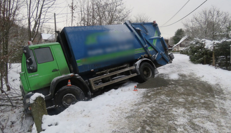 Svůj nákladní vůz neudržel na zasněžené silnici řidič, který jel obcí Bratrušov v místní části Osikov na Šumpersku. Dostal smyk a s autem skončil mimo vozovku.