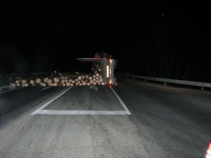 „V důsledku dopravní havárie byla ve večerních hodinách zatarasená silnice a vysypané klády poškodily také svodidla,“uvedla tisková mluvčí policie Jiřina Vybíhalová. Při nehodě se naštěstí nikdo nezranil.