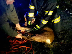 „V prolomeném ledu na rybníce u Tovačova zůstala bezmocná a zaklíněná srna. Hasiči na vodní, zamrzlou plochu vyrazili ještě za světla. Čekala je náročná cesta s fyzickým výkonem, ono prosekat se zhruba 150 metrů, to dá opravdu práci. Vše má dobrý konec, srnu jsme předali v pořádku mysliveckému spolku," řekl mluvčí hasičů Zdeněk Hošák.