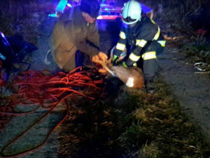 Štítky hasiči, srnka, záchrana, Tovačov, rybník, Kojetín