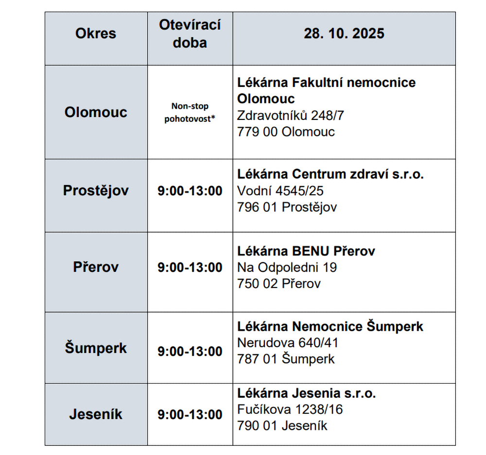 Obdobně jako při dalších státních svátcích přispívá Olomoucký kraj na pohotovostní provoz lékáren také 28. října. Pro potřebné léky si mohou lidé zajít v okresních městech od 9 do 13 hodin. V Prostějově bude pohotovostní službu držet Lékárna Centrum zdraví ve Vodní ulici, v Přerově Lékárna Benu na adrese Na Odpoledni 19, v Šumperku bude ve svátek otevřená lékárna v nemocnici v Nerudově ulici a v Jeseníku půjde o Lékárnu Jesenia ve Fučíkově ulici. Nákup léků bude možný i odpoledne či v noci a to v areálu FN Olomouc. „Výdejna léků v olomoucké fakultní nemocnici je navíc prostřednictvím takzvaného pohotovostního okénka k dispozici nepřetržitě,“ uvedla mluvčí Olomouckého kraje Eva Knajblová.
