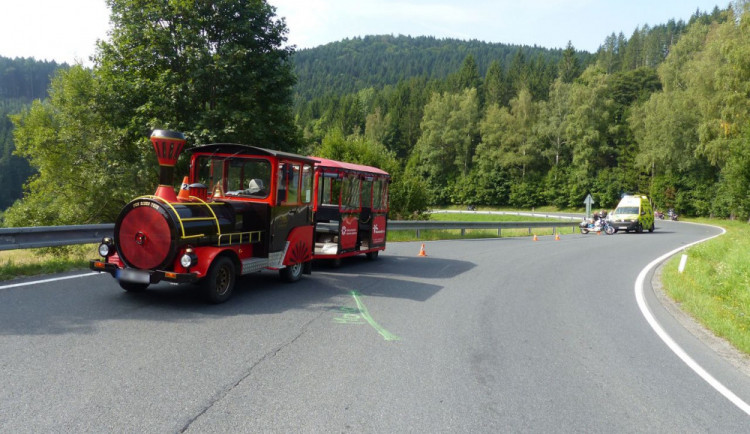 „Podle prvotního šetření tam sedmapadesátiletý motorkář v úseku klesání mezi vrcholem Pomezí a Lipovou, při výjezdu z pravotočivé zatáčky, nezvládl řízení svého motocyklu, přejel s ním do protisměru a levým bokem narazil do projíždějícího turistického vláčku, ve kterém cestovalo pět osob. Při nehodě se motocyklista lehce zranil a z místa nehody byl zdravotnickou záchrannou službou přepraven k ošetření do nemocnice," řekla policejní mluvčí Jiřina Vybíhalová.